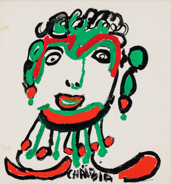 The arrival of Chaïbia in the art world is quite a legend: several signs predestined the young woman. In a zaouia, a Muslim sanctuary, a blind and deaf woman told her that she had a hidden talent. One night, Chaïbia dreamt that voices urged her to pick up a canvas and paintbrush. The next day, encouraged by her artist son, she began painting with her fingers on cardboard and wood. Married at the age of 13, Chaïbia was widowed mother by 15. To make a living, she cleaned wool. She never went to school and was illiterate for all of her life. Her son had a painting studio. One day, the painter Ahmed Cherkaoui (1934-1967), accompanied by the curator and critic Pierre Gaudibert, visited the studio, where they discovered the canvases of Chaïbia. Gaudibert encouraged her to exhibit her work. In 1966, her pieces were shown with success at the Goethe Institut in Casablanca. Afterwards, she participated in important art brut exhibitions. Several people emphasised the closeness of her works to the Cobra group, and it is said that one day Guillaume Cornelis van Beverloo dropped to his knees before her paintings. However, in Morocco the reception of her works was quite ambivalent. In the 1960s, the mostly male leaders of Moroccan artistic movements rejected her paintings, stating that they contributed to the underdeveloped image of Morocco.
